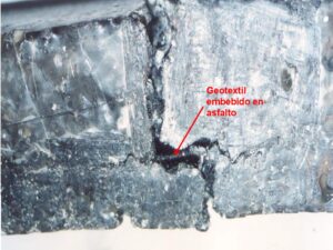 Su uso genera habitualmente una redireccionalidad localizada de la fisura ascendente, retardando su ascenso y reflejo en las capas superiores, e impidiendo el ingreso de agua superficial a las capas inferiores del pavimento y el consiguiente bombeo de finos. En la Figura 6 se observa un testigo tomado de una obra en el cual se ve la direccionalidad horizontal tomada por la fisura gracias al geotextil, con una velocidad de avance menor dada la normalidad respecto de la carga, previo a retomar la direccionalidad vertical en el reflejo de la fisura.